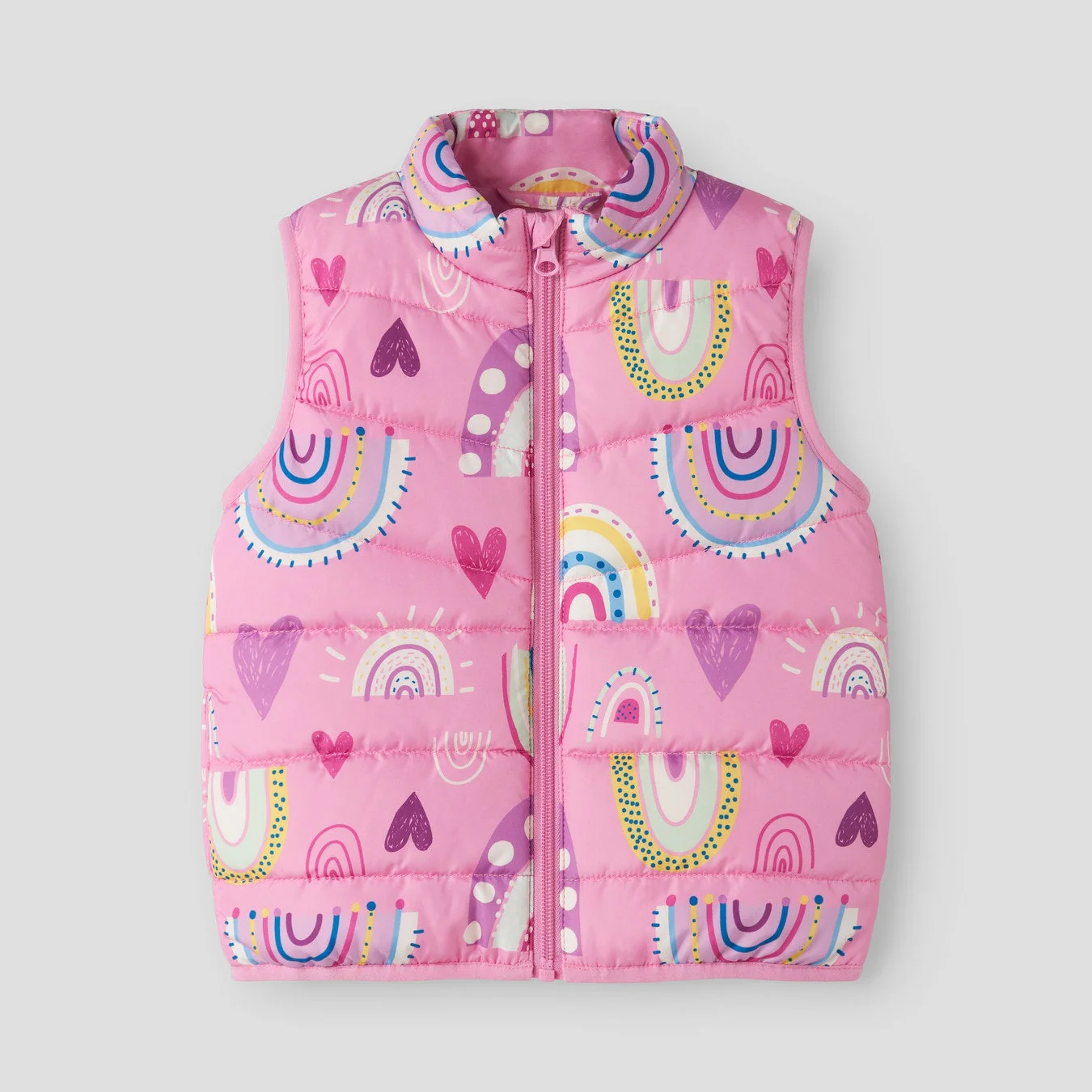 Αμάνικο μπουφάν με μοτίβο ουράνιο τόξο. Κλείνει με φερμουάρ στο μπροστινό μέρος.