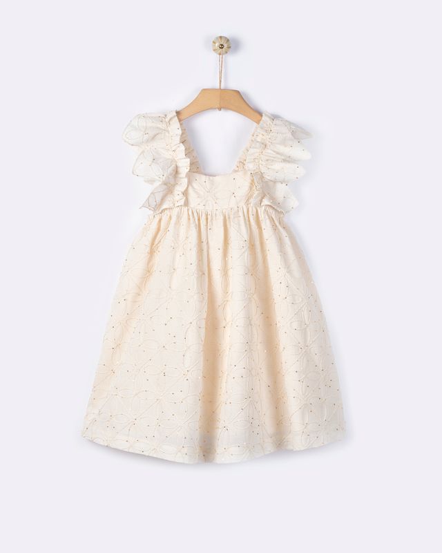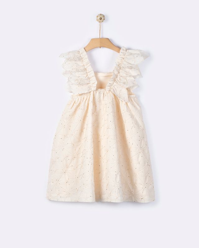 Αμάνικο φόρεμα με κεντήματα, ανοιχτή πλάτη και ιδιαίτερα βολάν στα μανίκια.
