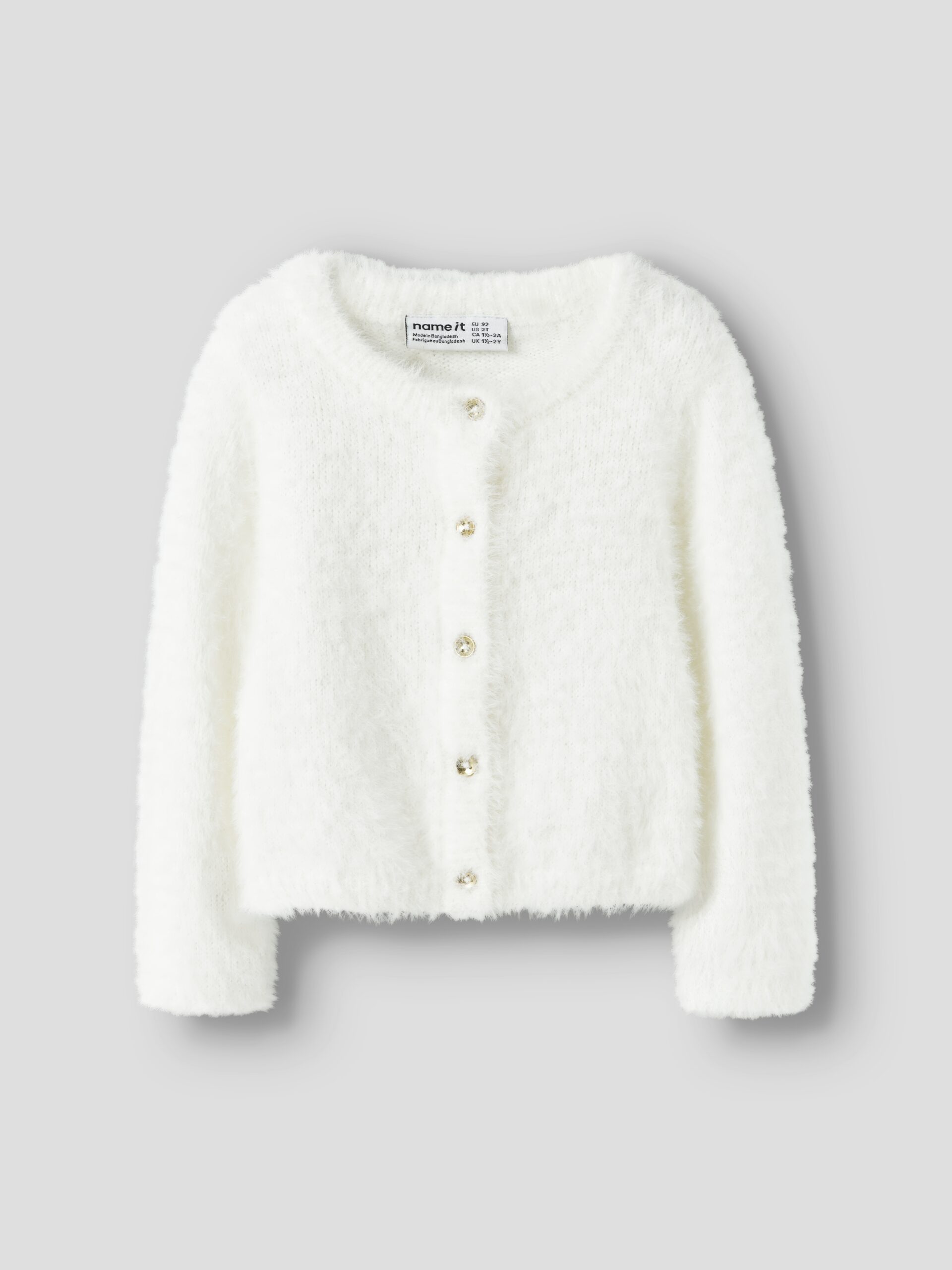 Απαλή χνουδωτή ζακέτα με χρυσά κουμπάκια στο μπροστινό μέρος.