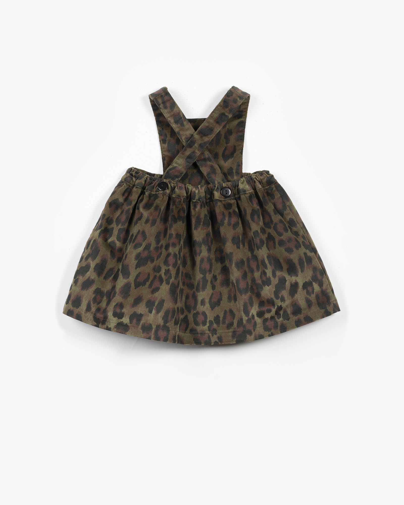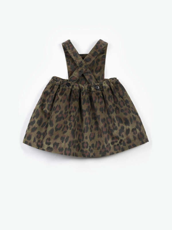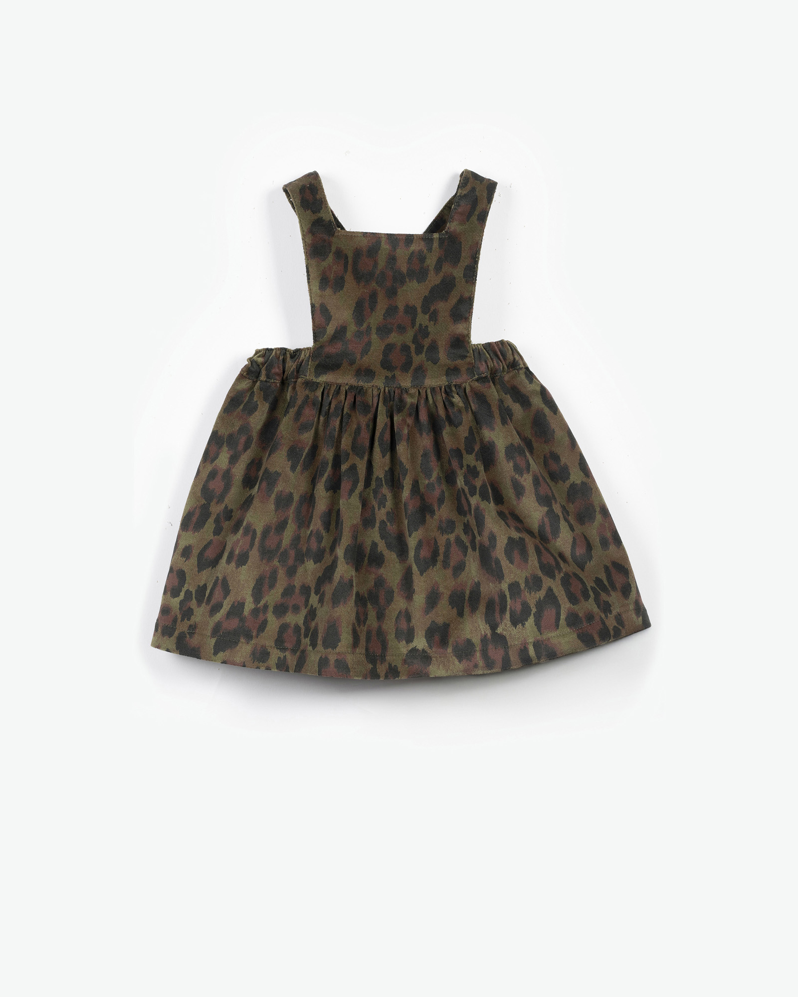 Animal print φόρεμα σε στυλ σαλοπέτα. Διαθέτει λάστιχο στη μέση και τιράντες που δένουν με κουμπί στην πλάτη.