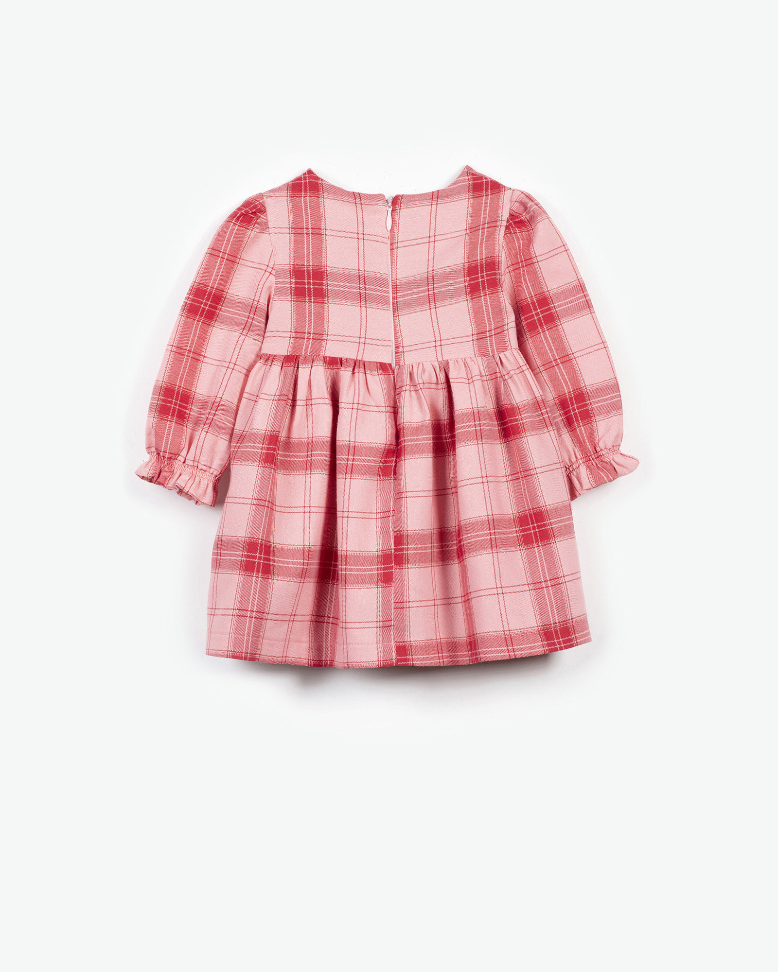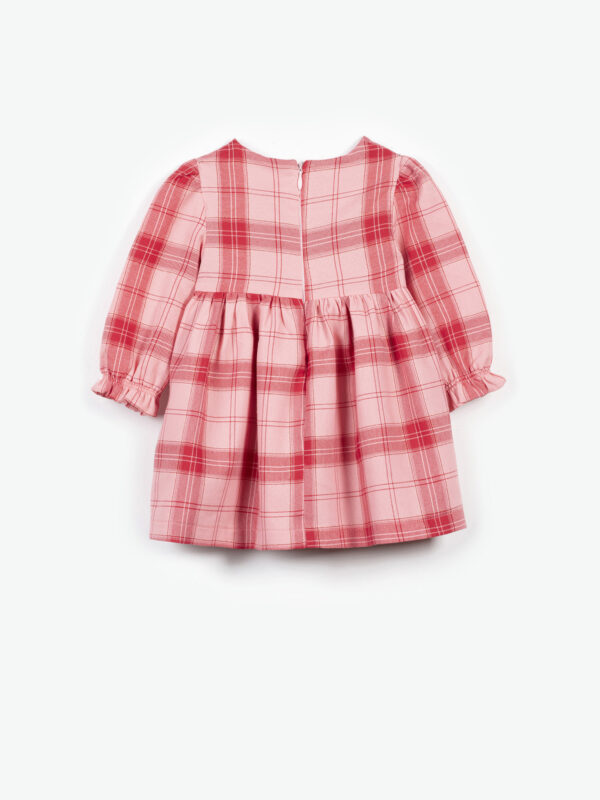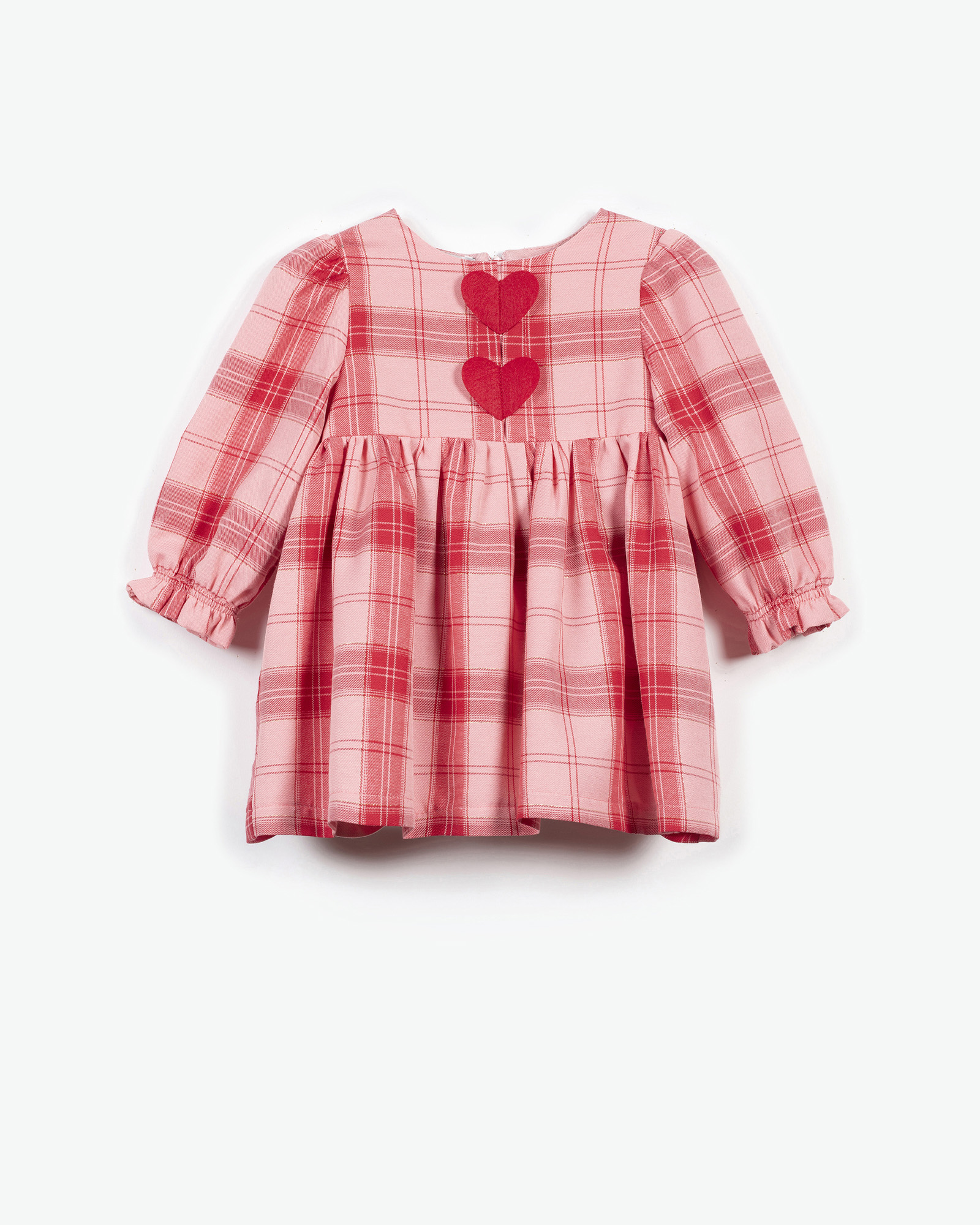 Μακρυμάνικο φόρεμα με καρό μοτίβο και καρδούλες στο στήθος. Διαθέτει λάστιχο στα μανίκια και κλείνει με φερμουάρ στην πλάτη.