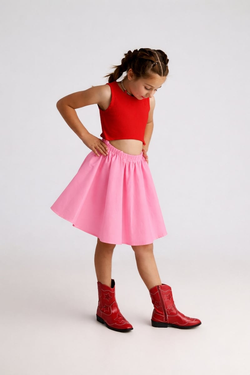 Φόρεμα σε συνδυασμό υφασμάτων με άνοιγμα στην κοιλιά και λάστιχο στη μέση.
