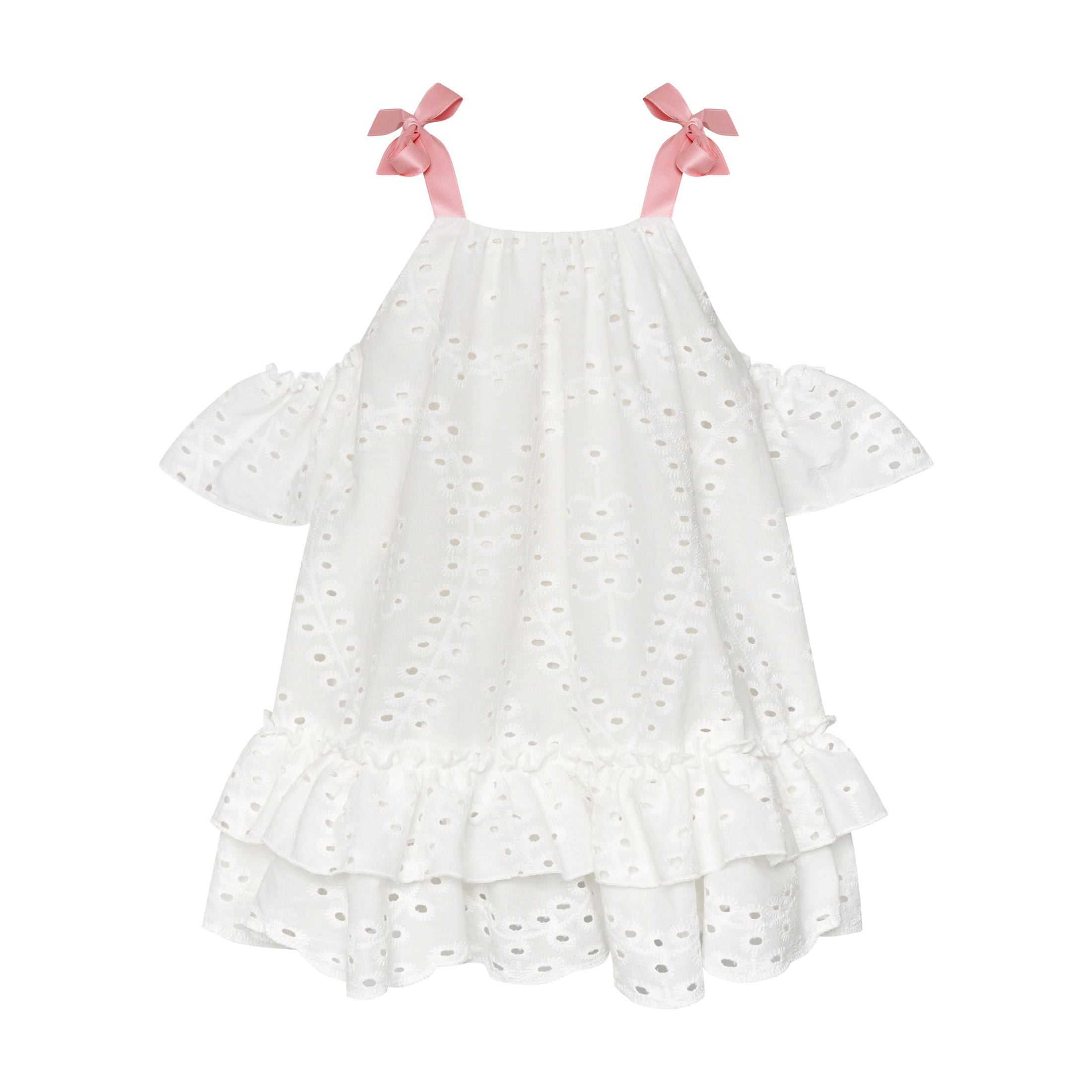 Φόρεμα broderie με κορδέλες για τιράντες και βολά που πέφτουν στα μπράτσα.