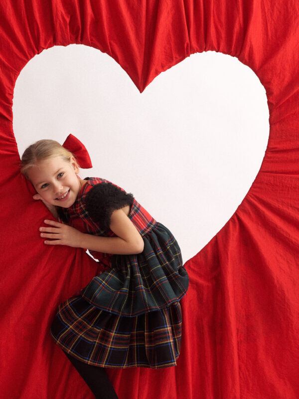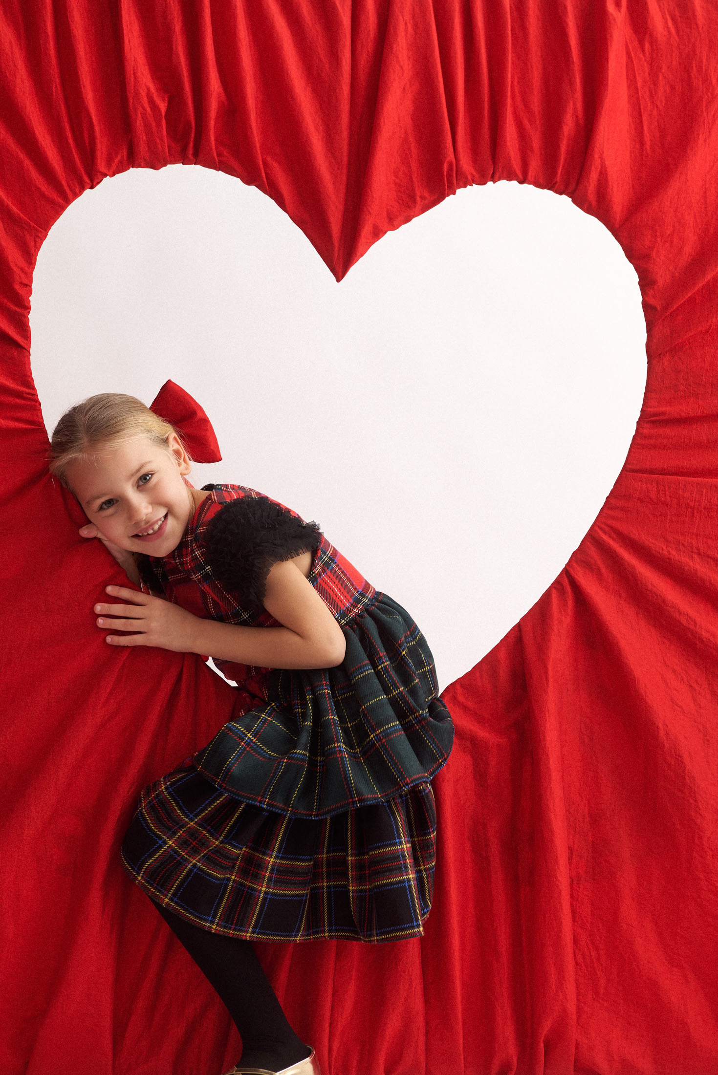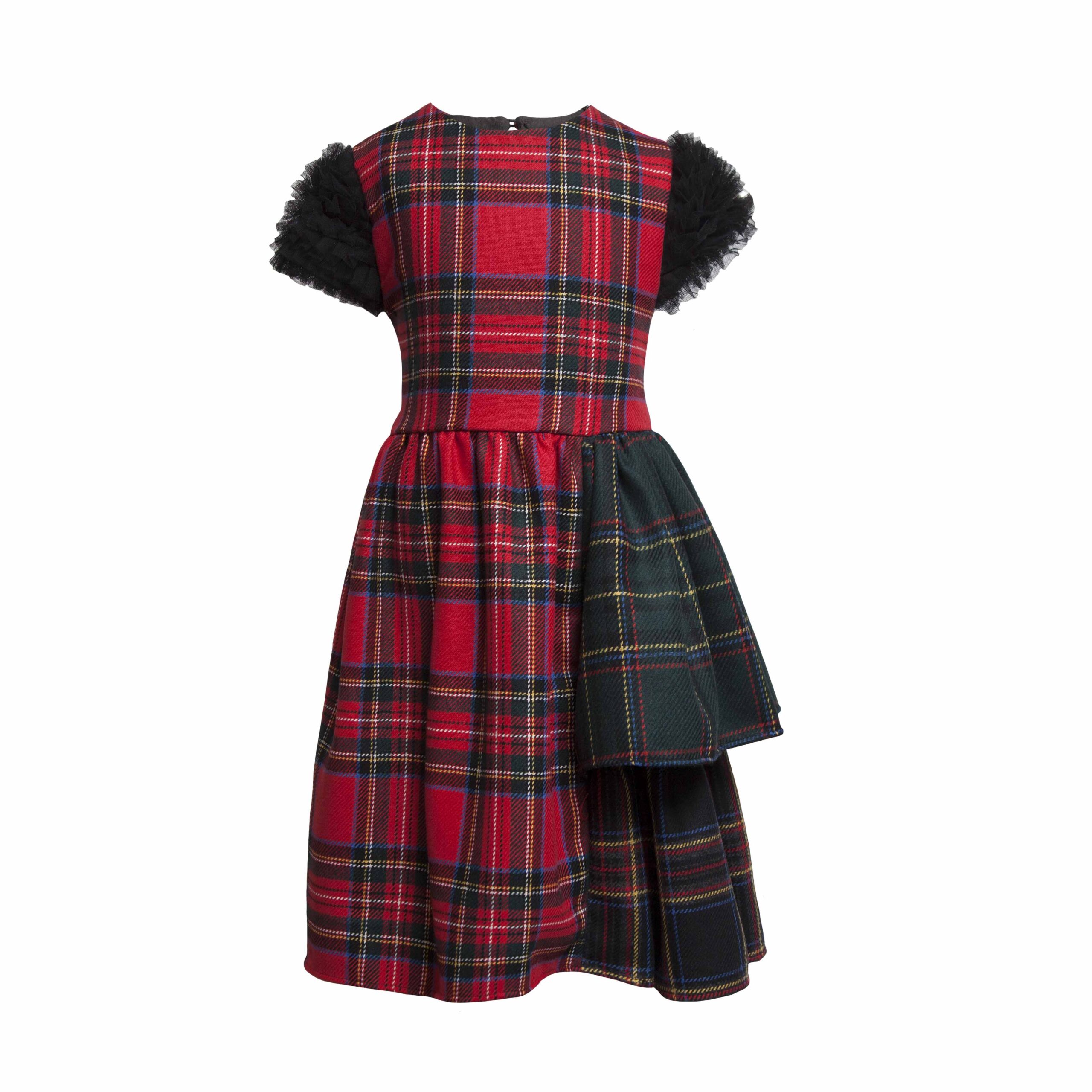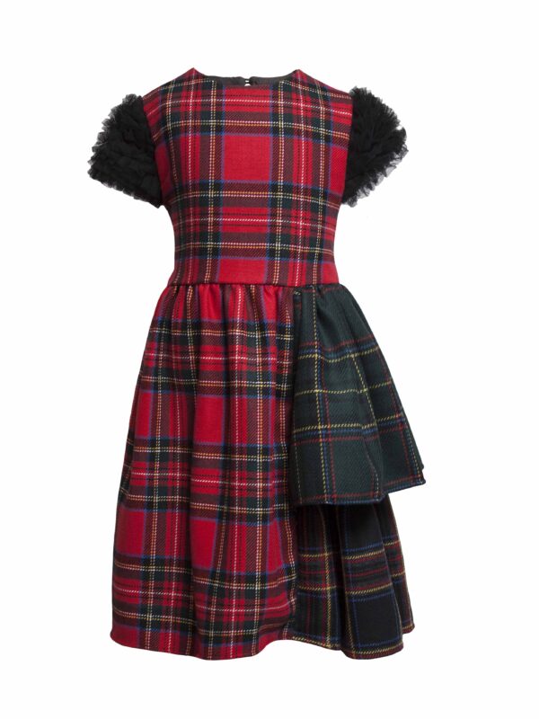 Φόρεμα με κοντό μανίκι από τούλι. Καρό μοτίβο σε δύο αποχρώσεις και βολάν στο κάτω μέρος. Κλείνει με κρυφό φερμουάρ στο πλάι.