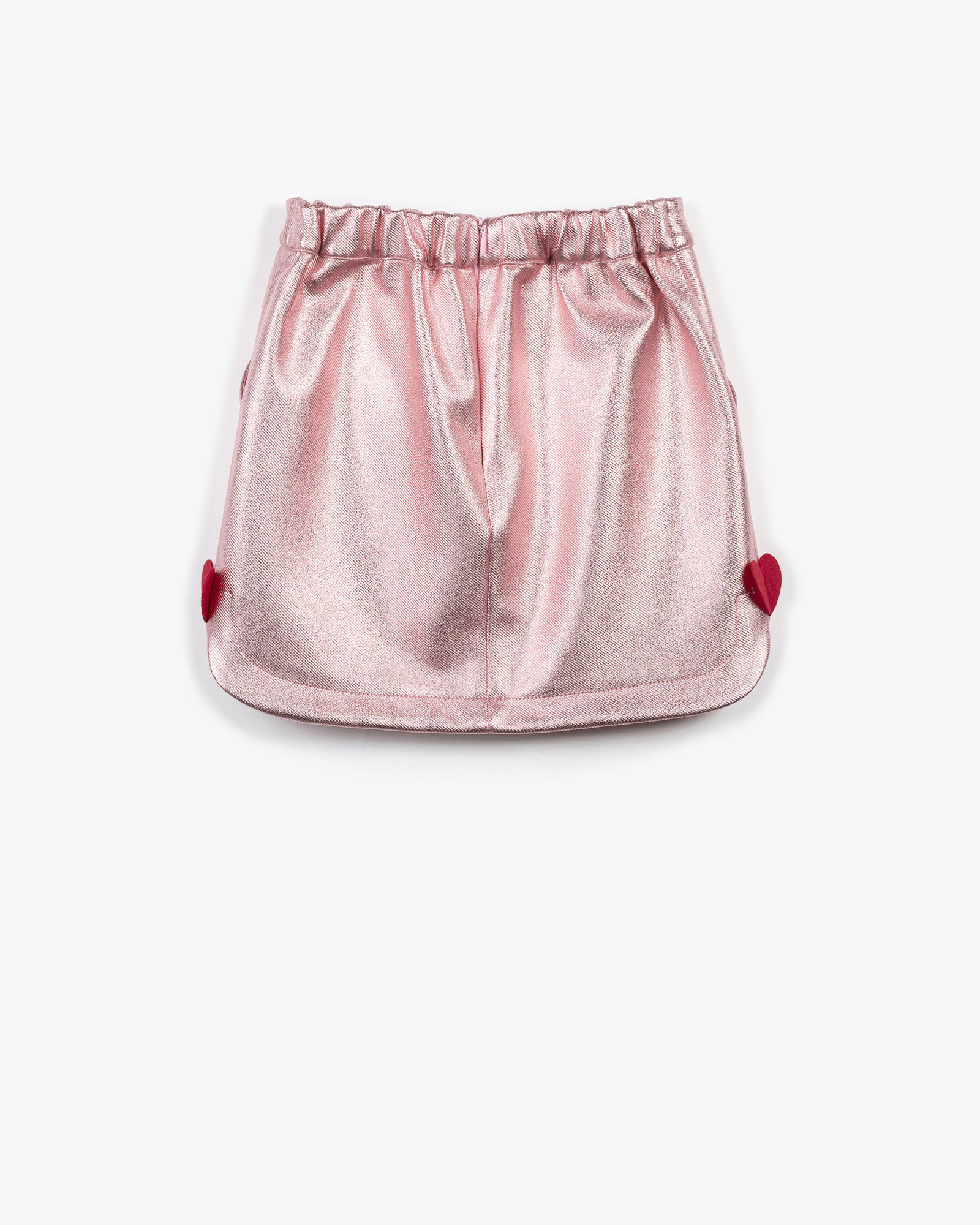 Μίνι φούστα από ύφασμα σε μεταλλική ροζ απόχρωση με λάστιχο στη μέση και καρδούλες στα πλαϊνά.