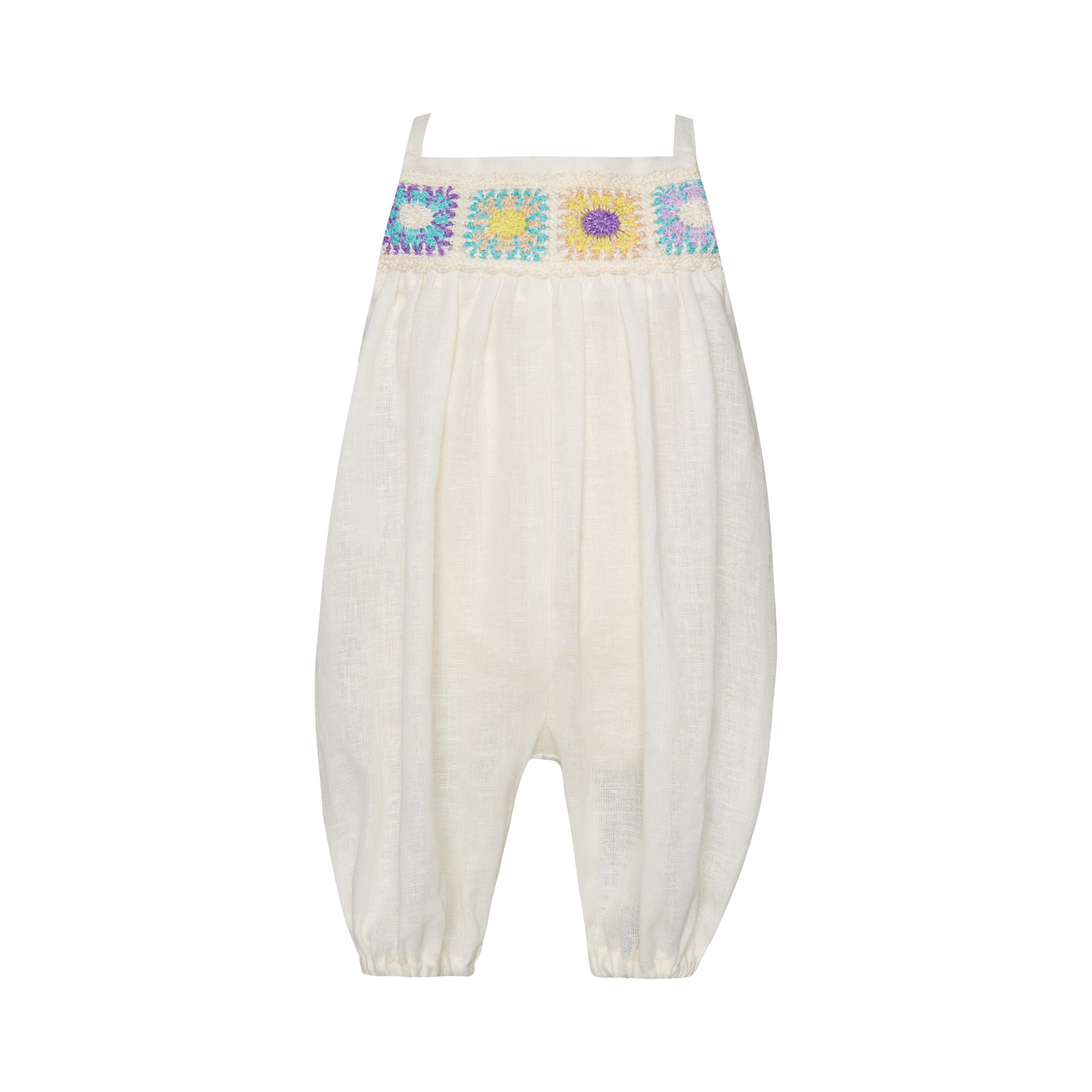 Ολόσωμη αμάνικη βρεφική φόρμα με λάστιχο στα πόδια και κέντημα στο στήθος.
