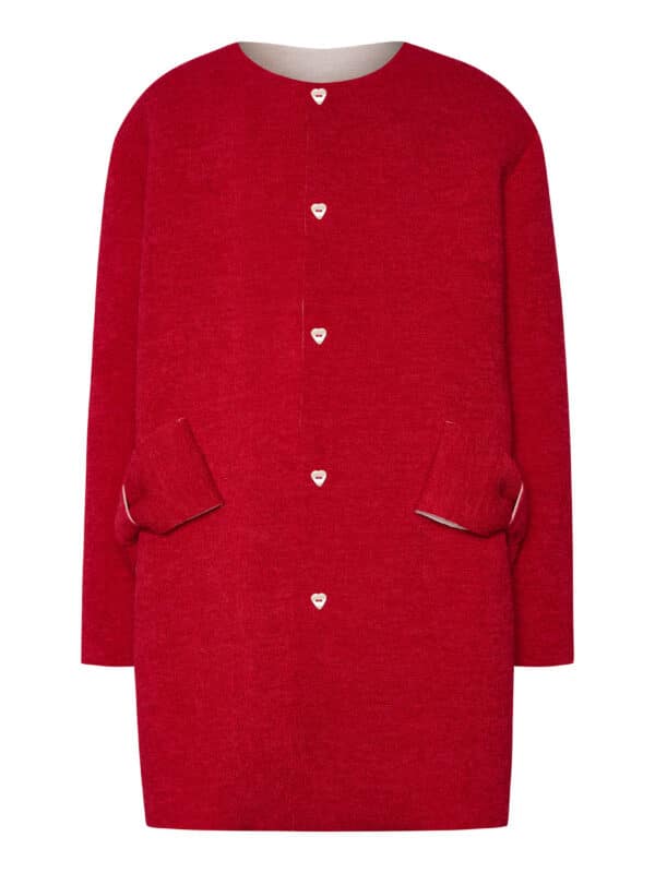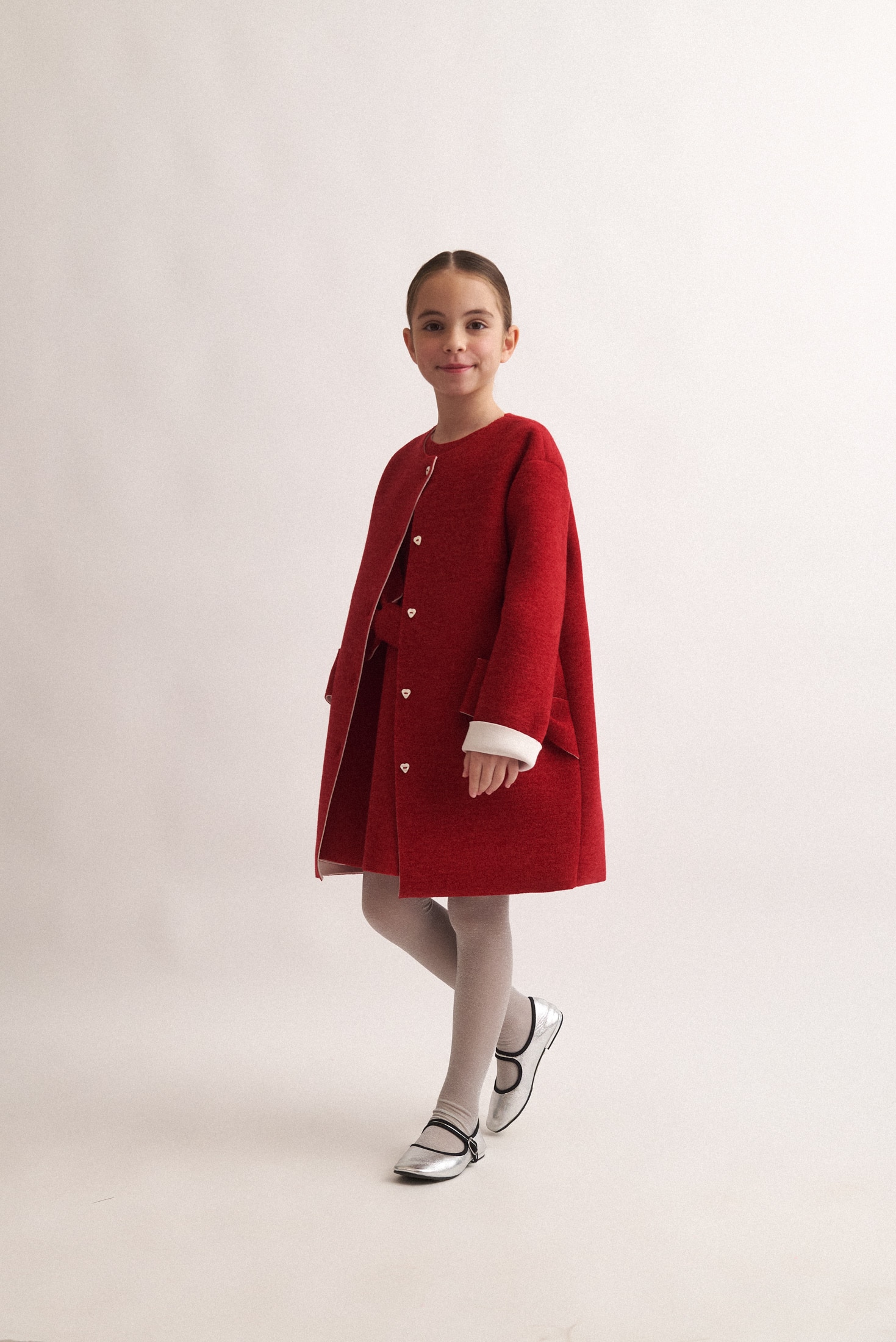Παλτό από νεοπρέν ύφασμα με στρογγυλή λαιμόκοψη. Κλείνει με κουμπιά σε σχήμα καρδιάς και διαθέτει φιόγκους δεξιά και αριστερά.