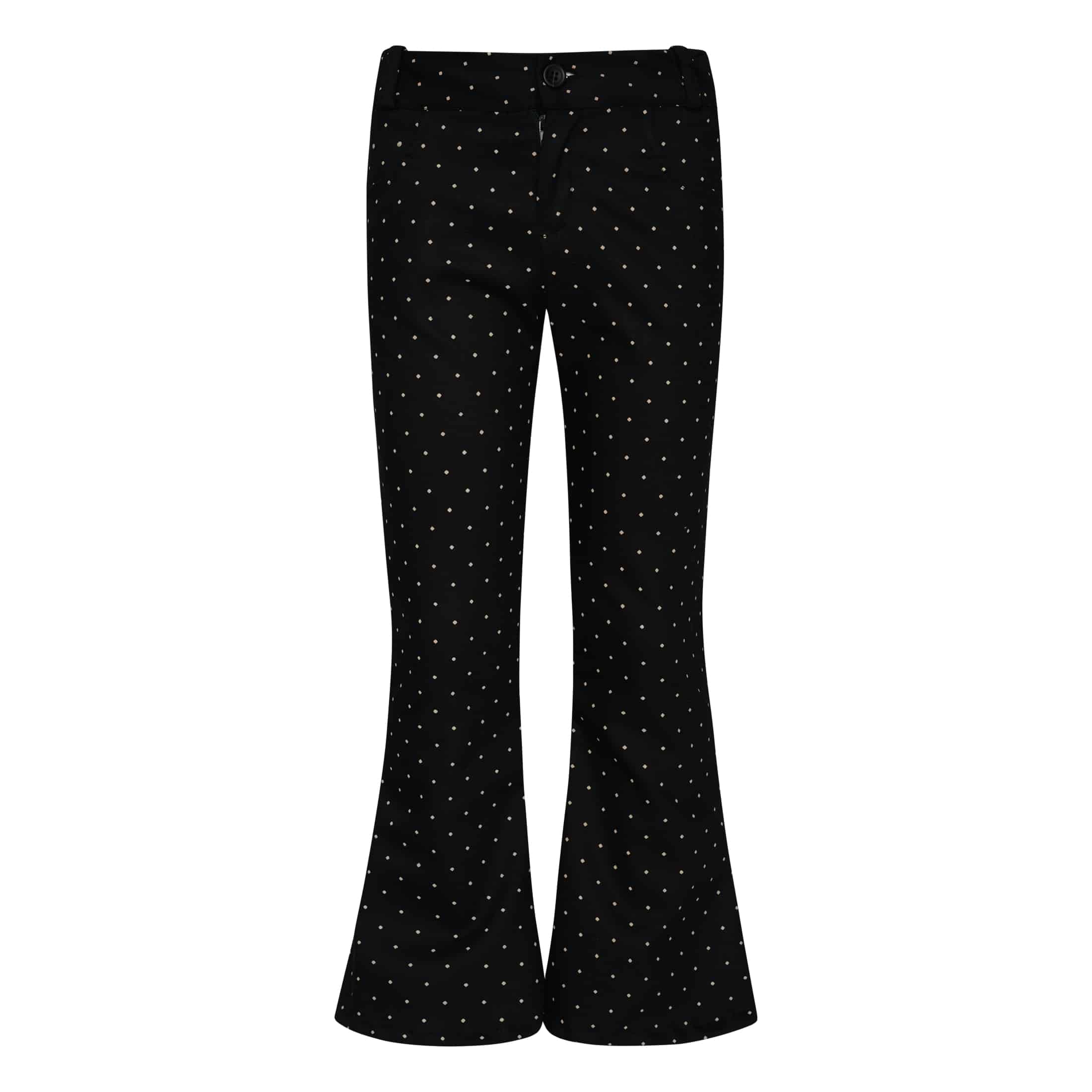 Καμπάνα παντελόνι σε μαύρο πουά χρώμα. Άνετη εφαρμογή και κλείσιμο με φερμουάρ στο μπροστά μέρος.
