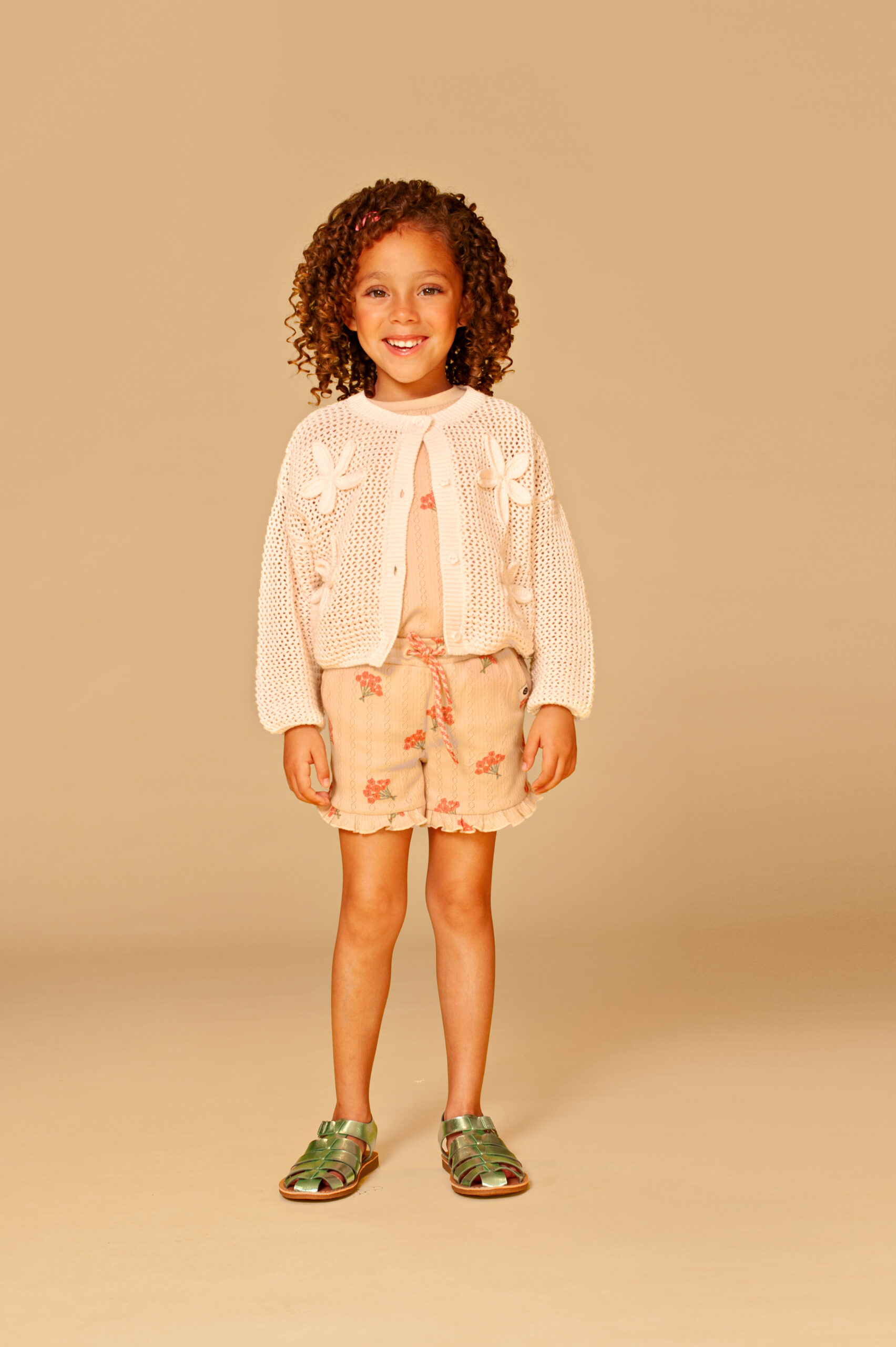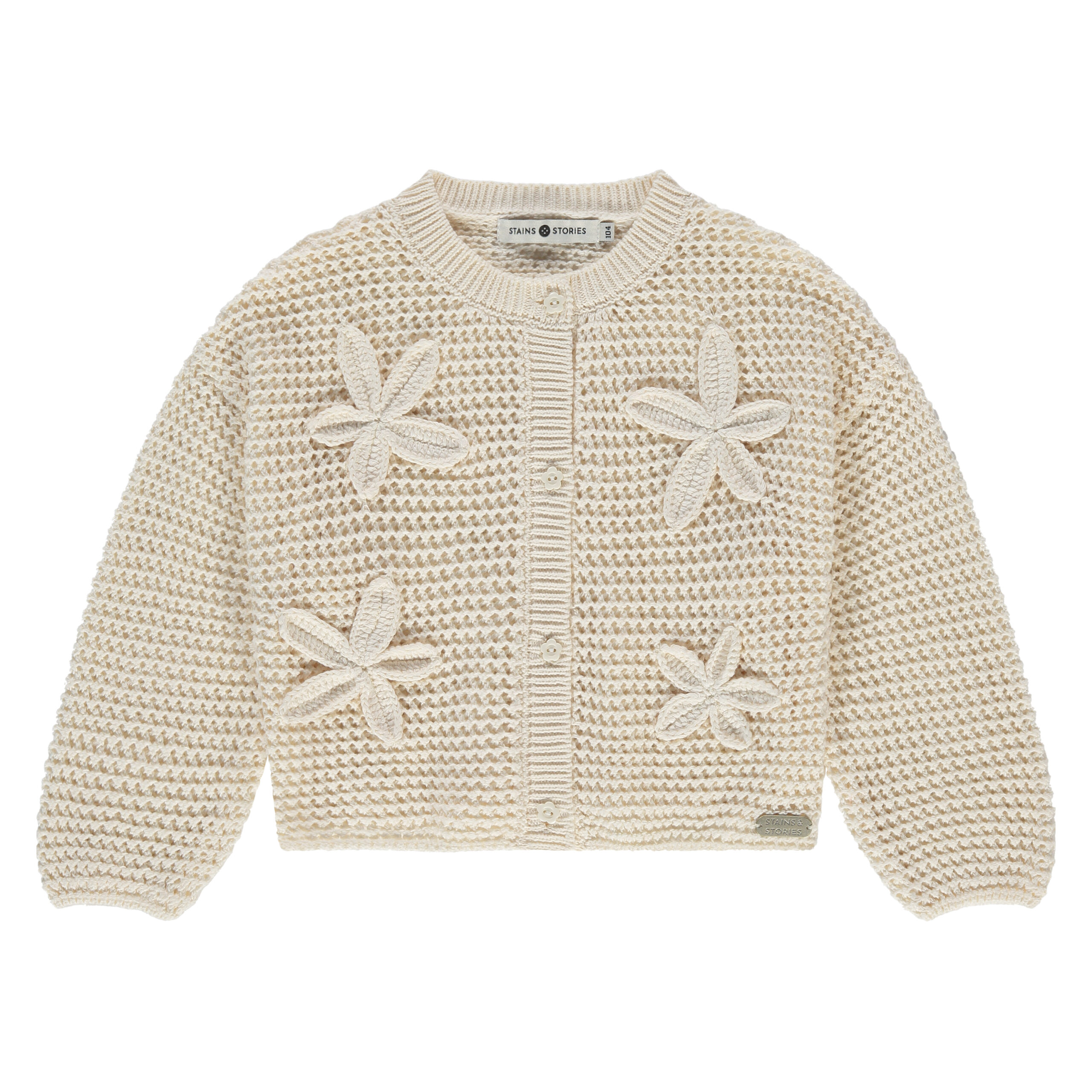 Πλεκτή ζακέτα σε αραιή καλοκαιρινή πλέξη με λουλούδια και κουπάκια.