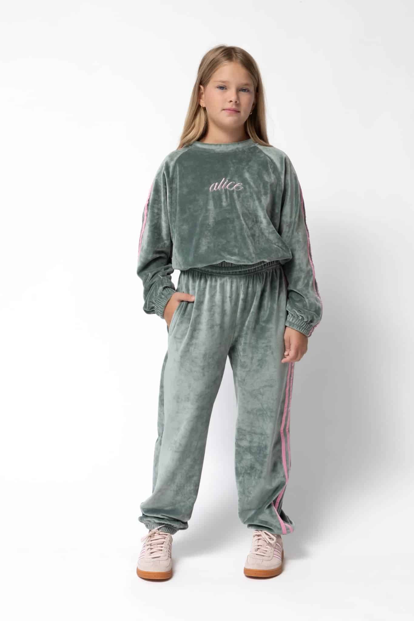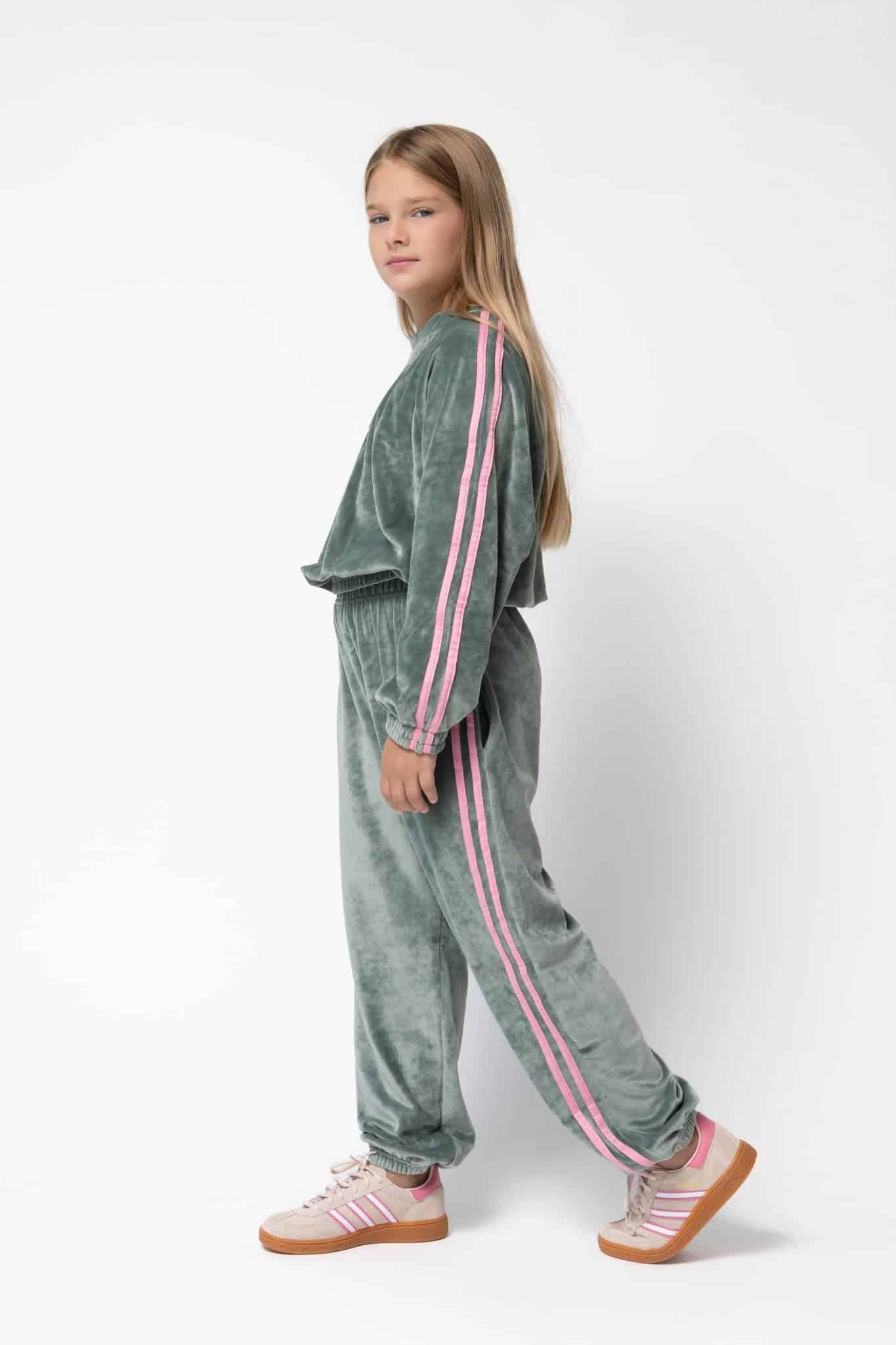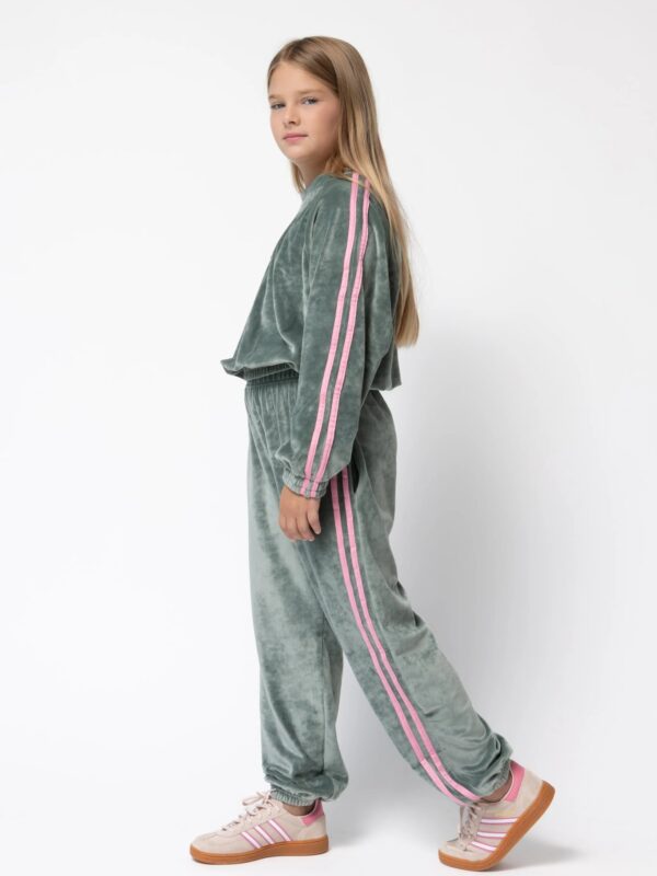 Σετ φόρμας από πολύ μαλακό ύφασμα βελουτέ. Η μπλούζα έχει κέντημα το logo μπροστά, μανίκια ρεγκλάν με διακοσμητικές ρίγες σε αντίθετο χρώμα. Το παντελόνι έχει λάστιχο στη μέση και στα ματζάκια, διακοσμητικές ρίγες στην μία πλαϊνή , ενώ στο πίσω μέρος διαθέτει τσέπη με σχέδιο ρίγες και σηματάκι. Ένα εύκολο σύνολο για όλες τις ώρες, που χαρίζει άνεση και στύλ.