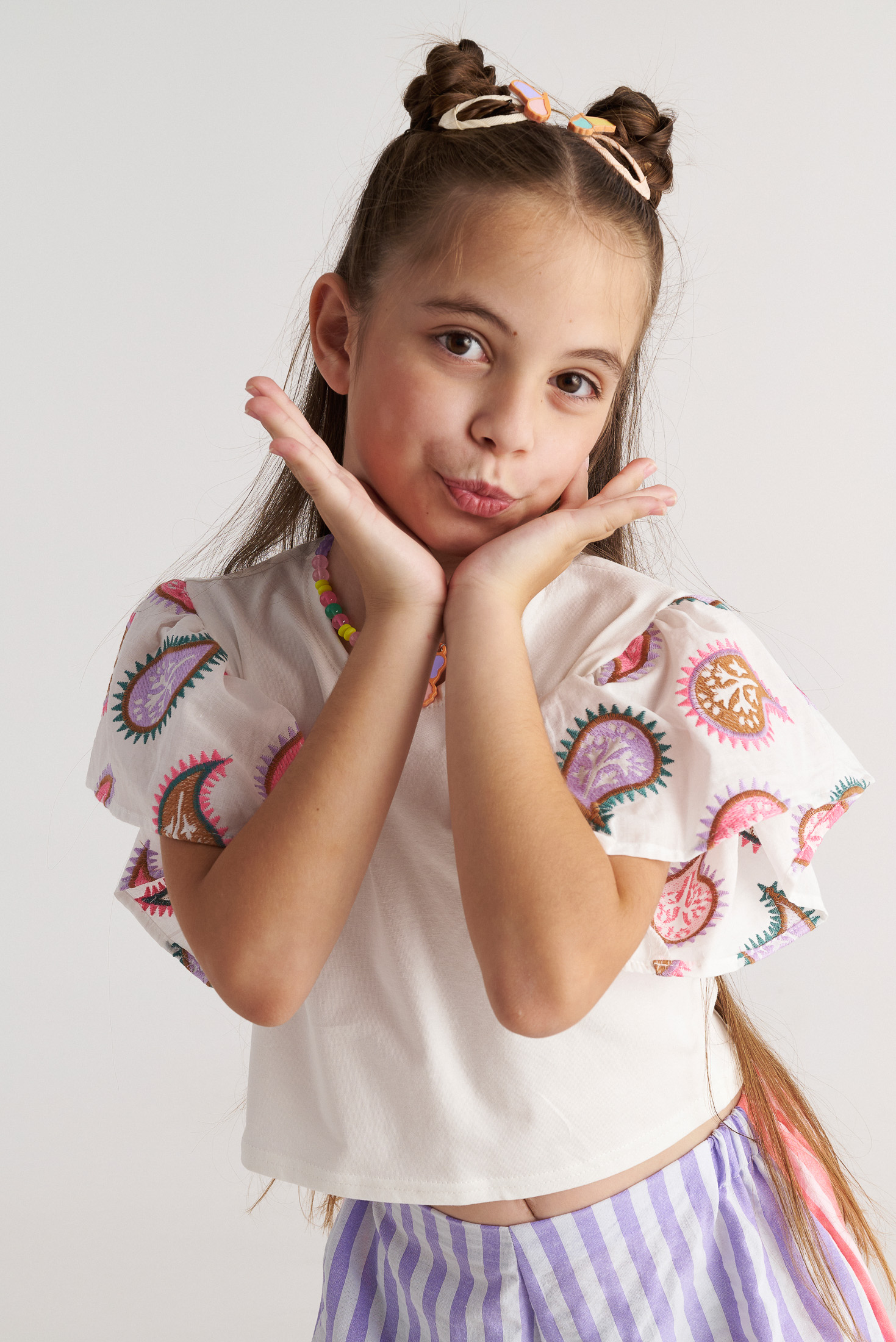 Σετ που αποτελείται από cropped τοπ με βολάν στα μανίκια και ριγέ σορτσάκι με διαφορετικά χρώματα στην μπροστινή και την πίσω πλευρά και λάστιχο στη μέση.