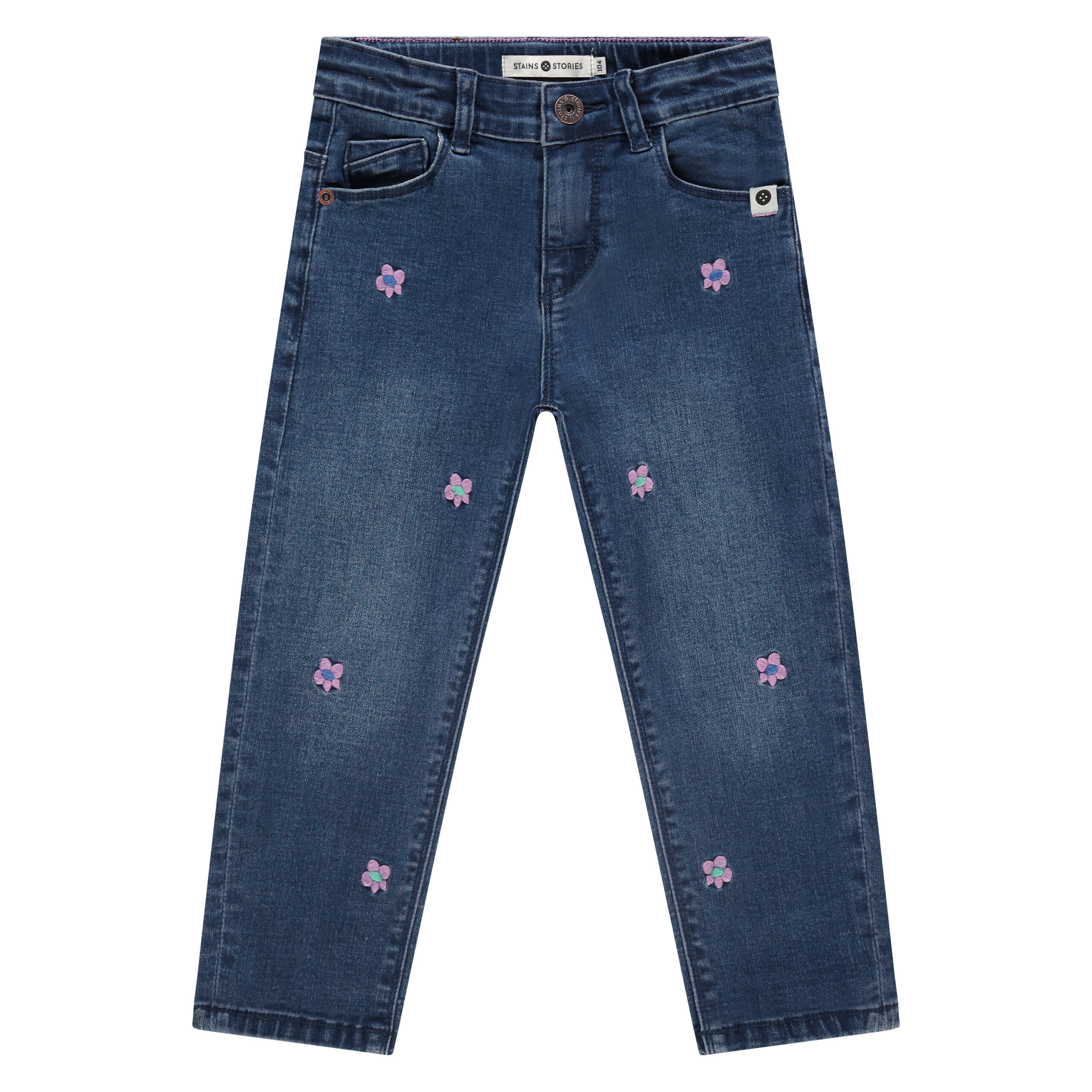 Τζιν παντελόνι σε στενή γραμμή με κεντημένες μαργαρίτες στο μπροστινό μέρος.