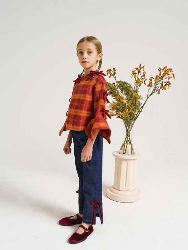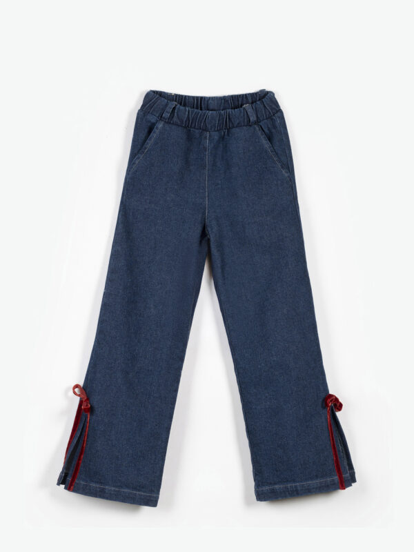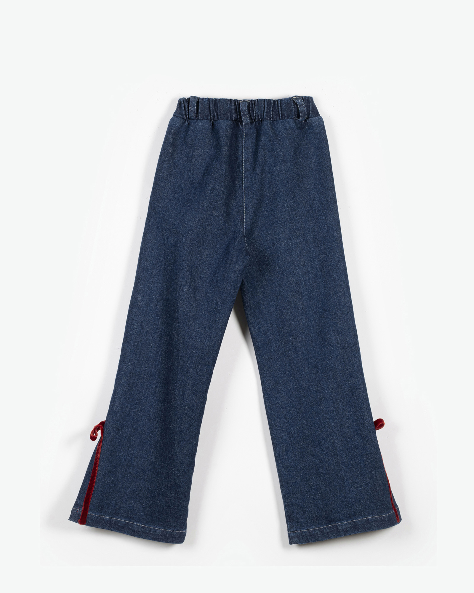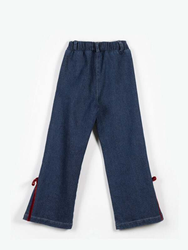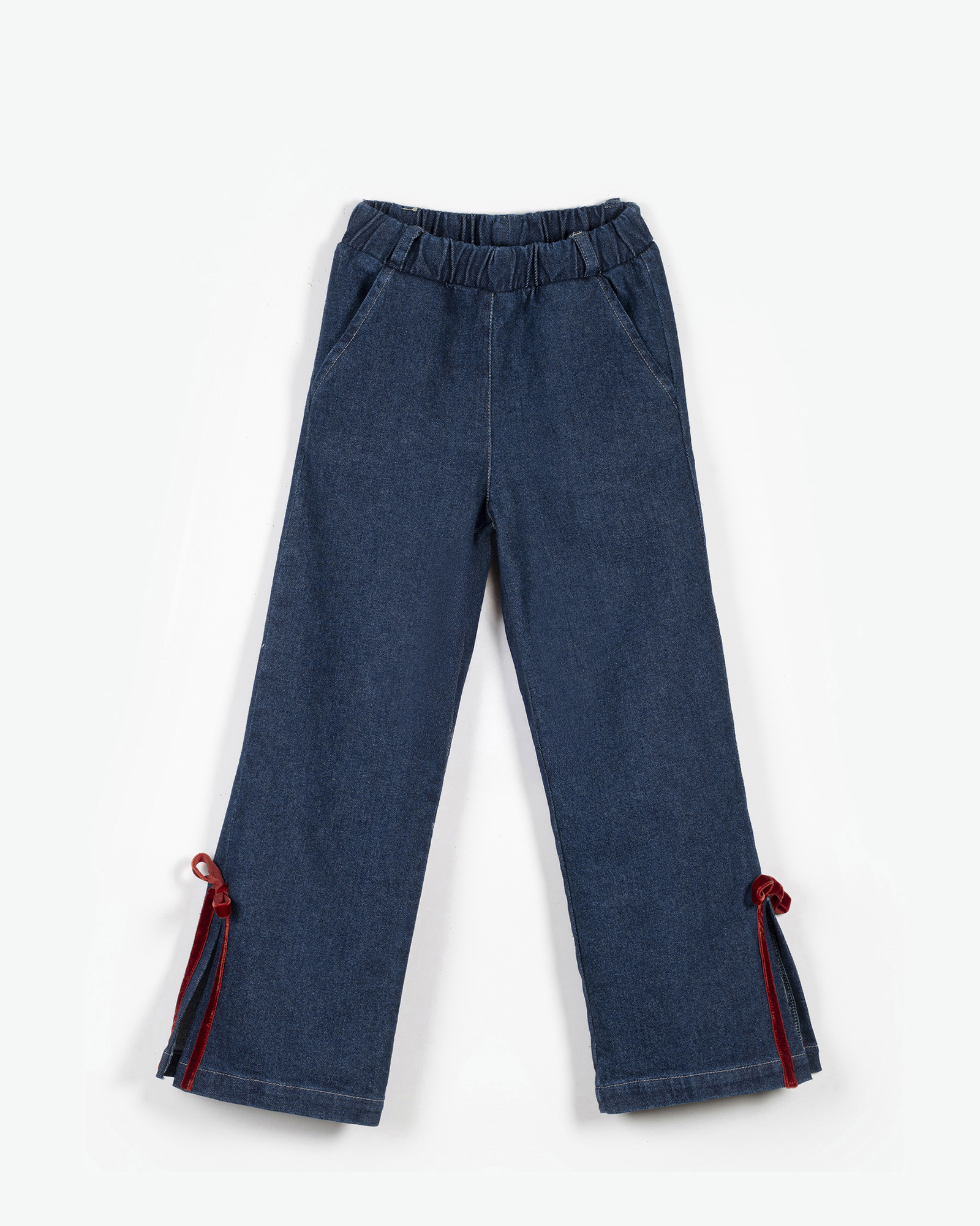 Τζιν παντελόνι καμπάνα με ανοίγματα στο πλάι. Διαθέτει λάστιχο στη μέση.