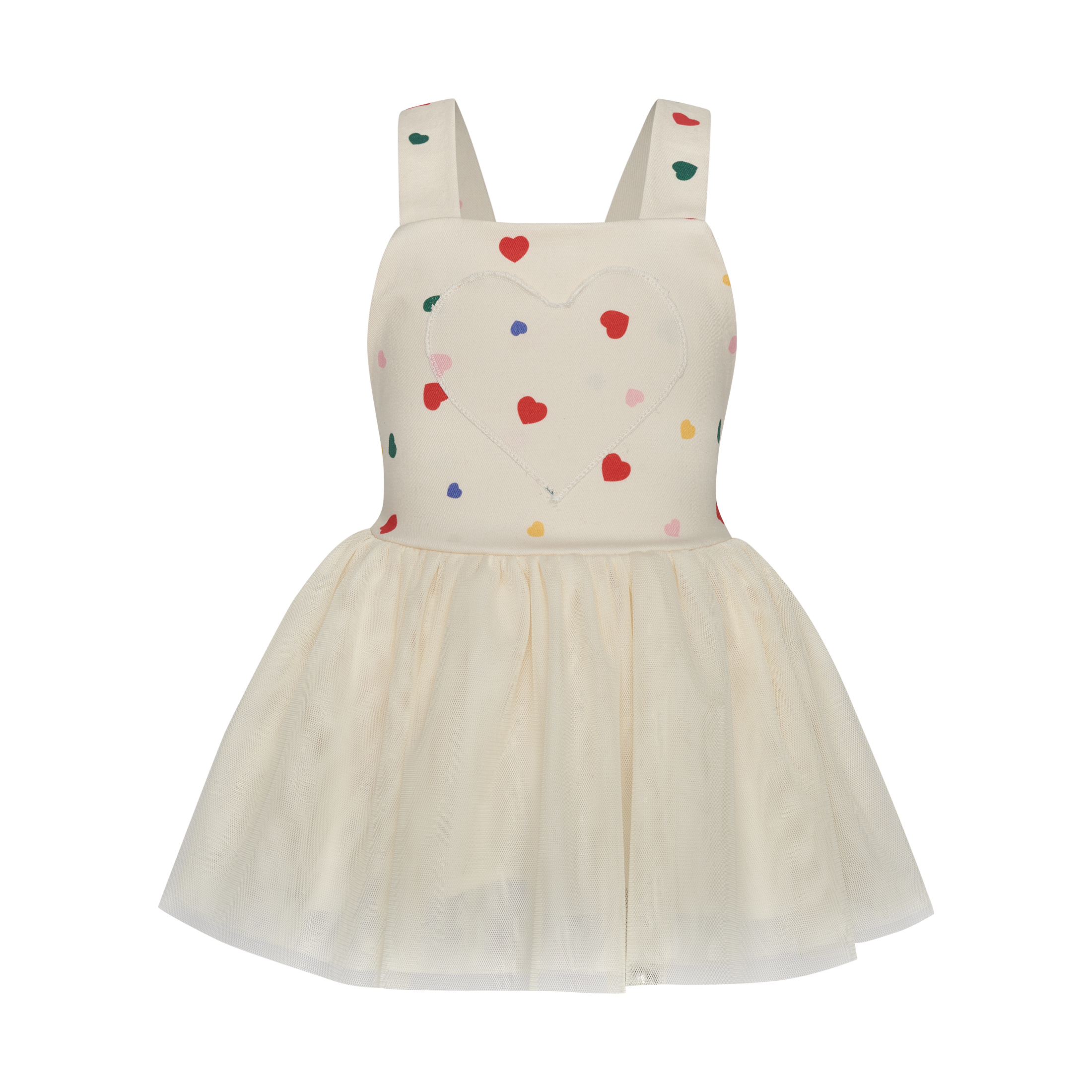 Βρεφικό φόρεμα με denim ύφασμα στο πάνω μέρος και μοτίβο με καρδιές και τούλινη φούστα με βαμβακερή φόδρα. Διαθέτει λάστιχο στη μέση και κουμπάκια καρδιές στις τιράντες.